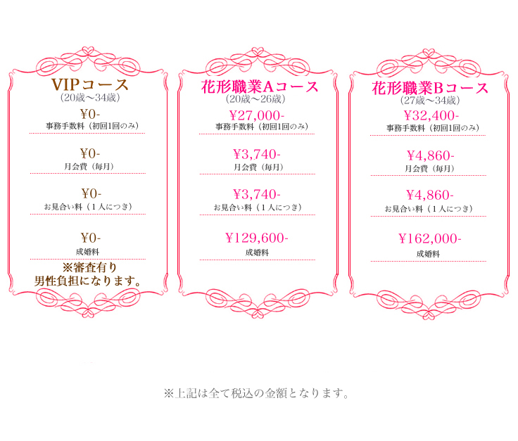 成婚料に関しては男性持ちも可能ですが、男性持ちにするとお見合いを断られる事も多くなりますのでご相談お願い致します。 |